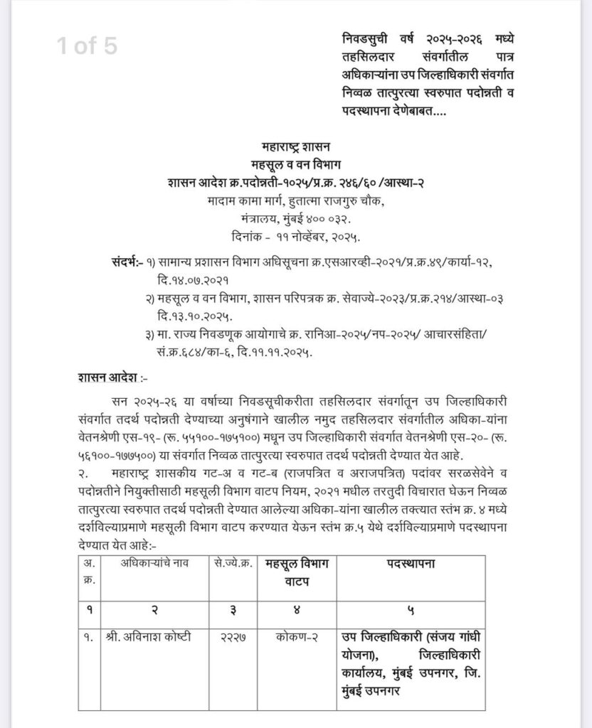 त्यानुसार आधी बढती व नंतर बदलीचां आदेश बुधवार दि.११ नोव्हेंबर २०२५ रोजी महसूल व वन विभागाने जारी केला आणि या आदेशानुसार उप-जिल्हाधिकारी अविनाश कोष्टी यांची मुंबई उपनगर जिल्हाधिकारी कार्यालयात( संजय गांधी योजना) विभागात त्यांना “उपजिल्हाधिकारी” पदी नियुक्ती देण्यात आली आहे.