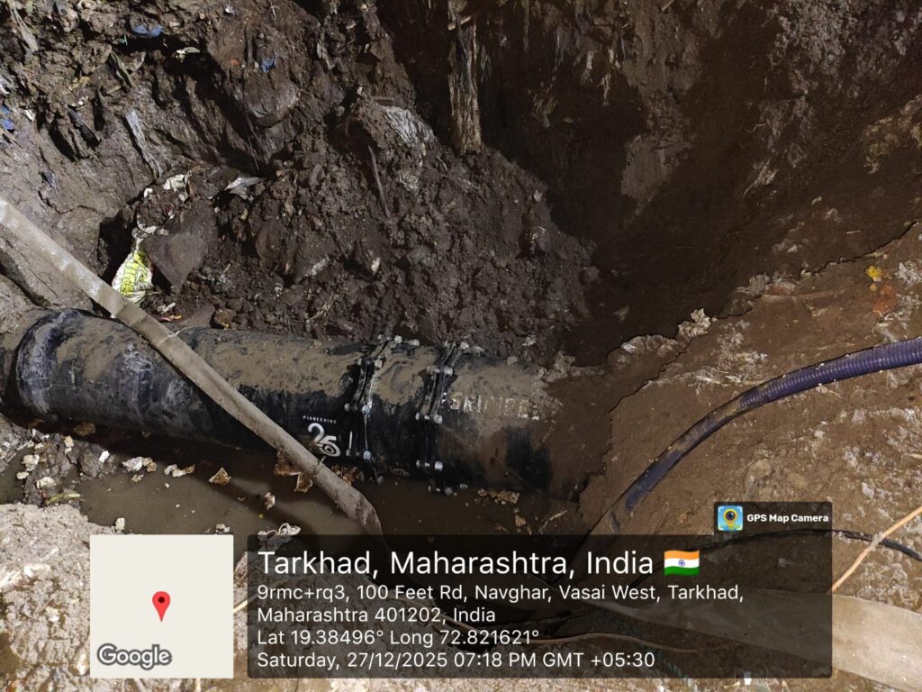 वसई विरार शहर महापालिकेच्या प्रभाग समिती “एच” नवघर मणिकपूर शहर विभागास पाणी पुरवठा करणारी ६०० मि.मी व्यासाची सूर्या योजनेची जलवाहिनी शनिवार दि.२७ डिसेंबर रोजी दु.१.३० वाजता सनसिटी भागात नवीन टाकीचे पायलिंगचे काम चालू असताना नादुरुस्त (लिकेज) झाली होती.