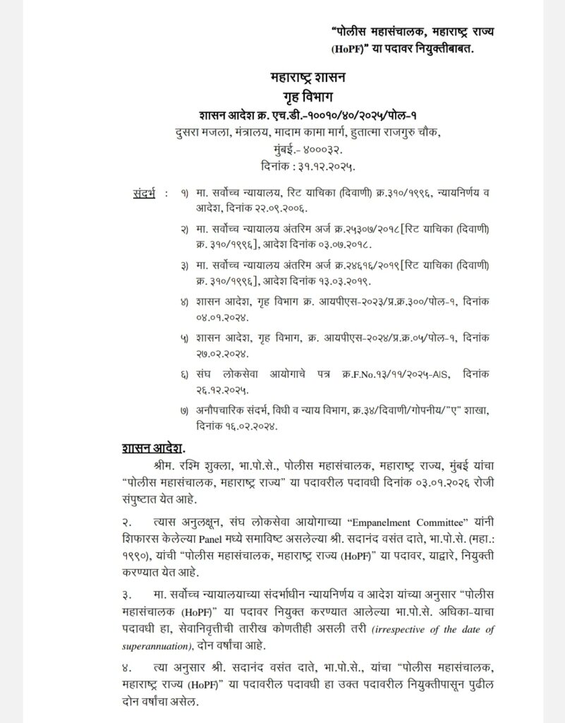 विशेष बाब म्हणजे महाराष्ट्र सरकारने त्यांच्या आदेशात म्हटले आहे की, महाराष्ट्र राज्याच्या पोलीस महासंचालक (डीजीपी) भारतीय पोलीस सेवा डॉ. रश्मी शुक्ला यांचा ‘महाराष्ट्र राज्याचे पोलीस महासंचालक’ म्हणून कार्यकाळ दि.३ जानेवारीला २०२६ रोजी संपत आहे. त्यानंतर सदानंद दाते हे अधिकृत रित्या हा पदभार स्वीकारतील.