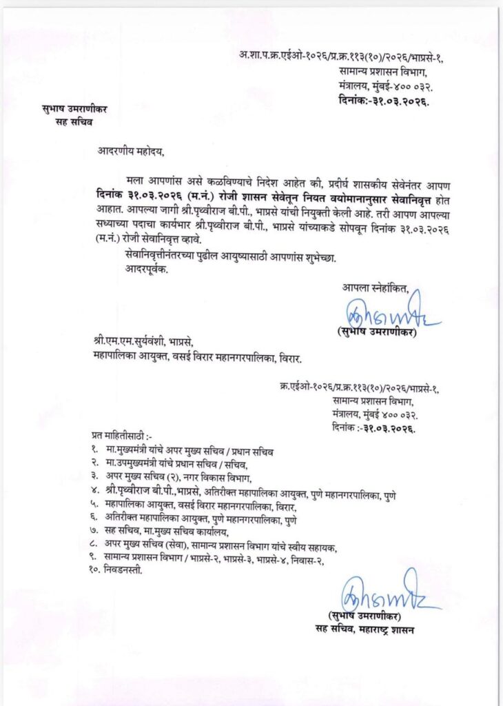 मंगळवारी सकाळी राज्यशासनाने याबाबतचे आदेश जारी केले आहेत. आयुक्त मनोजकुमार सूर्यवंशी हे दि. ३१ मार्च २०२६ रोजी सेवेतून निवृत्त होत आहेत.